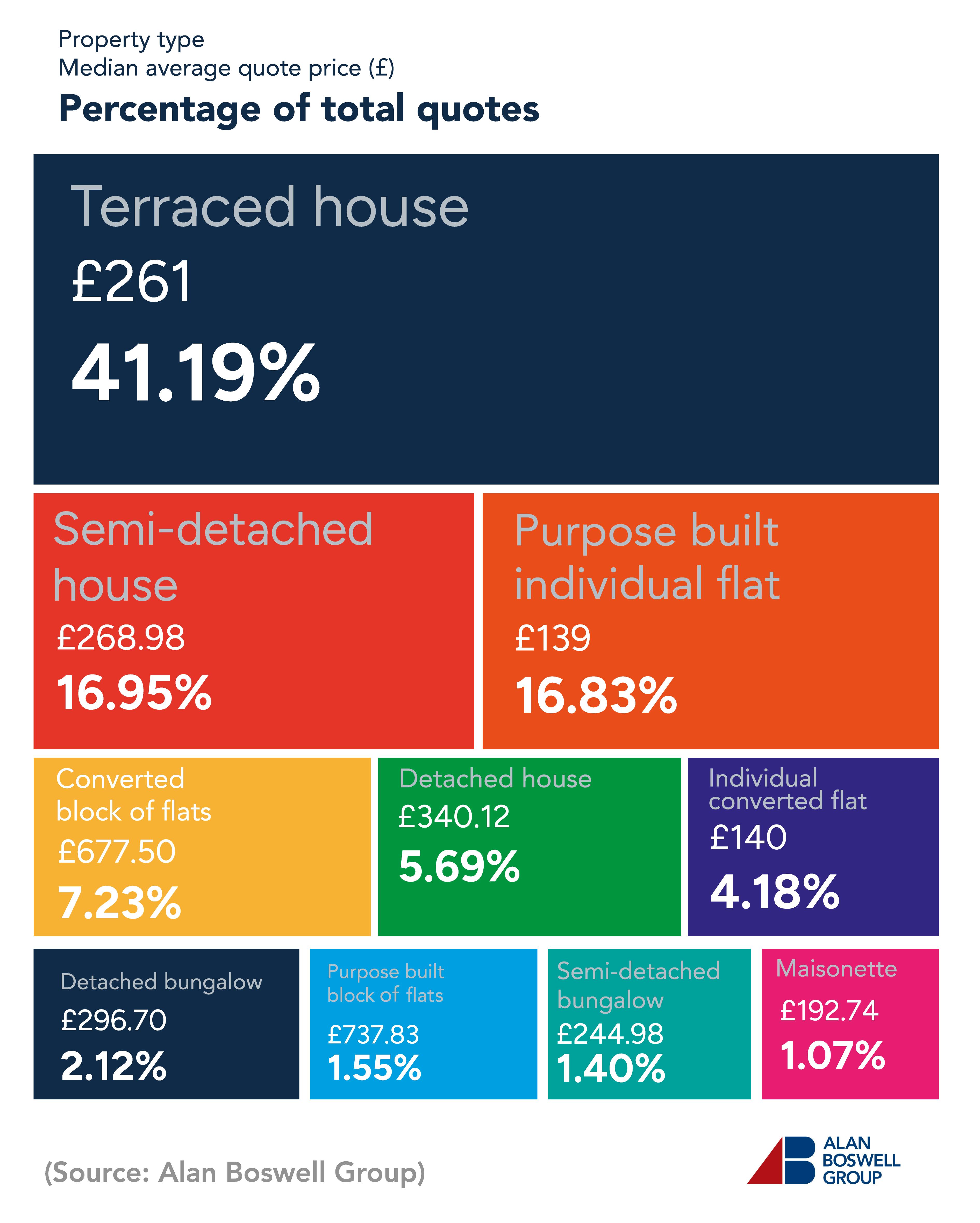 In total, the most common type of quote for landlord insurance was for terraced housing. Accounting for more than two in five (41.19%) quotes, the average cost of landlord insurance for this type of property was £261 a year.