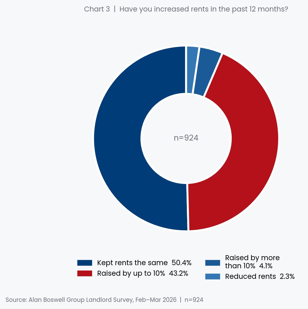 Despite declining profitability, half of landlords (50%) kept rents unchanged over the past year. Of those who raised rents, the majority (43% overall) did so by up to 10%, while a smaller 4% raised rents by more than 10%. Just 2% reduced their charges. The decision to raise rents does not appear to be primarily driven by greed: many landlords who stated they increased rents in this survey also reported declining profitability, suggesting they are partly absorbing cost pressures before passing them on.