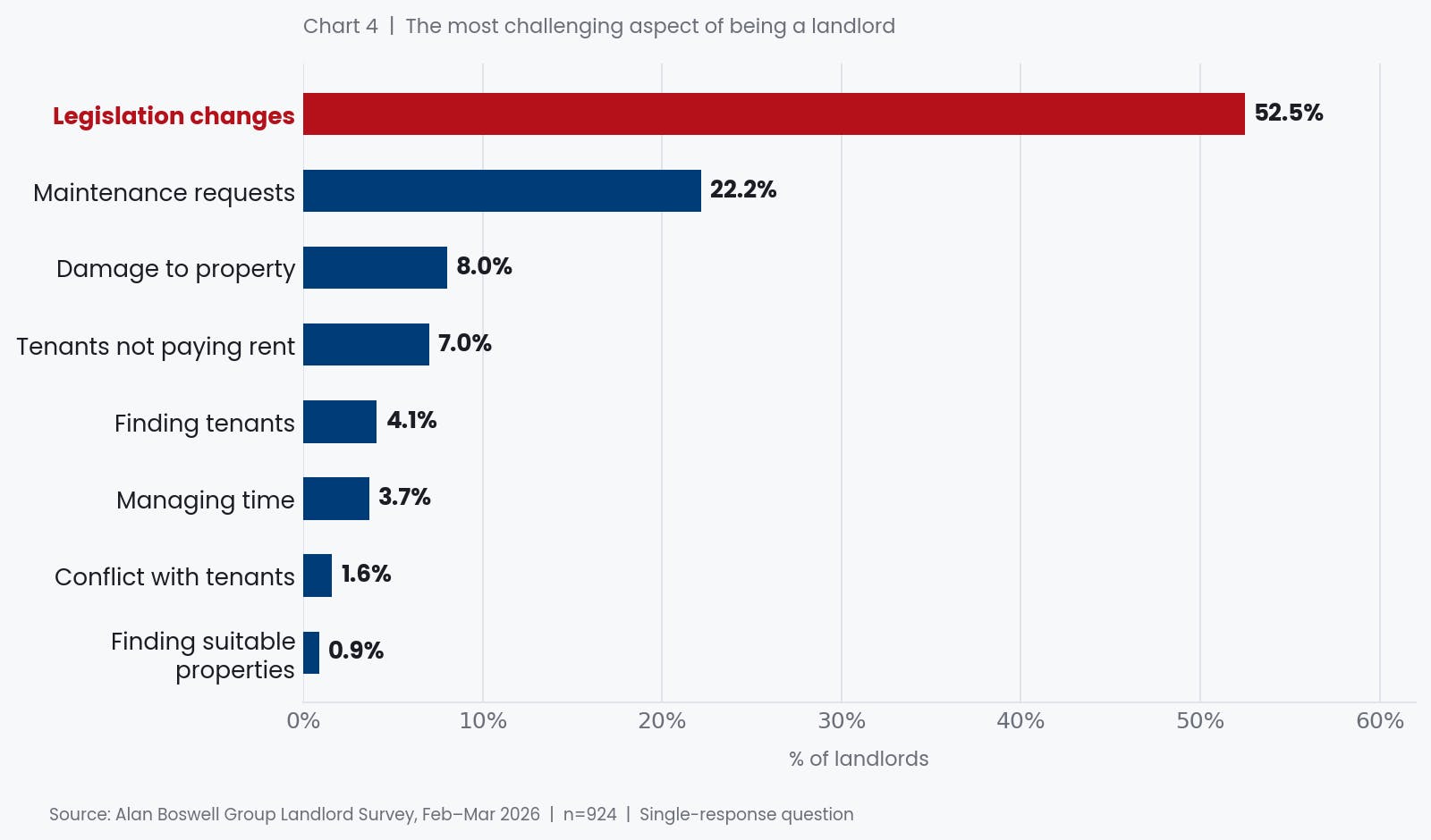 When asked to identify the single most challenging aspect of being a landlord, the responses were unambiguous. More than half (52%) chose legislation changes. This is more than double the second-placed concern, maintenance requests, at 22%. Property damage (8%), tenants not paying rent (7%), and finding tenants (4%) follow at a considerable distance.