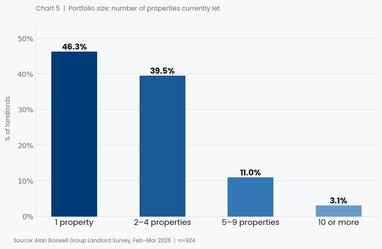 The scale of that legislative concern is impossible to ignore. With the Renters' Rights Act 2025 due to come into effect from May 2026 alongside changes to mortgage interest relief, energy efficiency requirements, and other reforms, landlords are clearly feeling the cumulative weight of regulatory change. Critically, this is not merely a concern of large or professional landlords: single-property owners, who make up 46% of those surveyed, are just as likely to cite it.