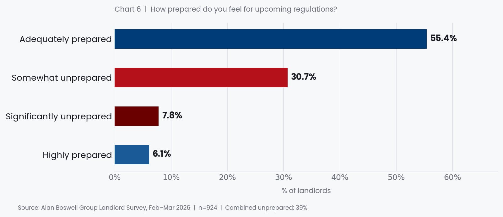 Given that legislation ranks as the sector's foremost challenge, it is particularly notable that a significant proportion of landlords do not feel ready for what is coming. Just 6% describe themselves as highly prepared. A majority (55%) feel adequately prepared, but 31% feel somewhat unprepared, and a further 8% feel significantly unprepared.