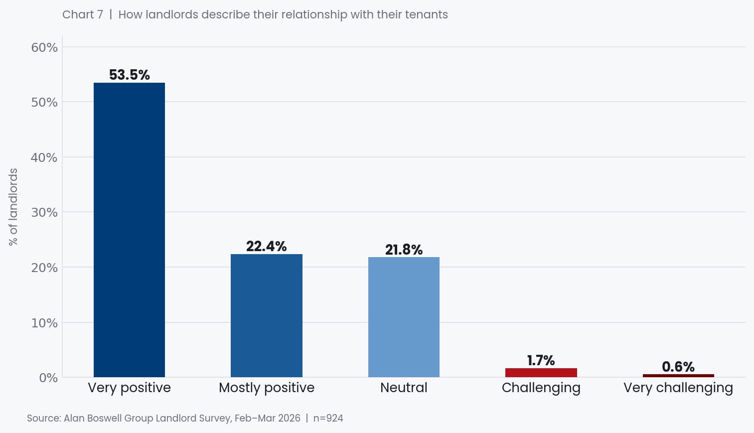 This finding is worth dwelling on. Much of the public discourse around the private rented sector positions landlords and tenants in adversarial terms. The data here suggests the reality, at least as experienced by landlords, is considerably more collaborative. Whether tenants would characterise their relationships in the same way is a question for a separate study, but the prevalence of positive sentiment on the landlord side is a notable counterpoint to the prevailing narrative.